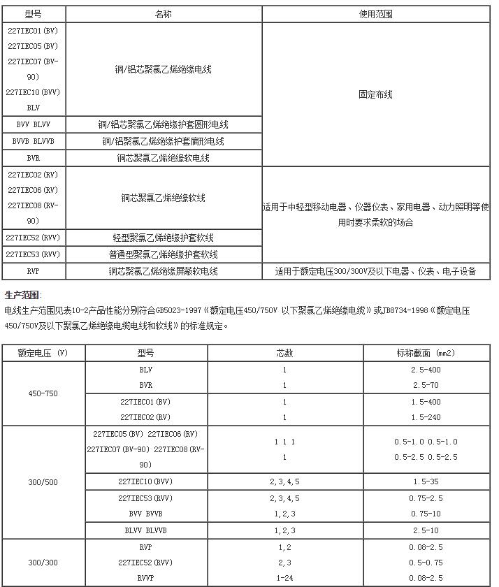 本產(chǎn)品適用于交流額定電壓450/750V及以下的家用電器、小型電動工具、儀器儀表及動力照明裝置電源連接,其型號、名稱及使用范圍見表。電線的工作溫度除BV—90、RV—90為90℃外,其余均為700℃。