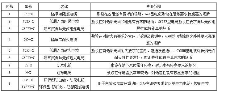 注:1、X-表示常用的電纜型號。2、特種電纜型號是在常規(guī)電纜型號前加特種型號。